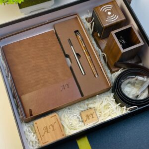 Black Softline Notebook with Pen, Sock Set, Wooden Cufflinks,Belt and a Notecard