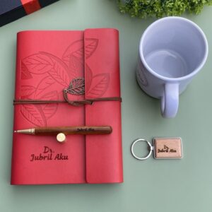 Red Leatherbound with Pen,Wooden Keyholder and White Mug
