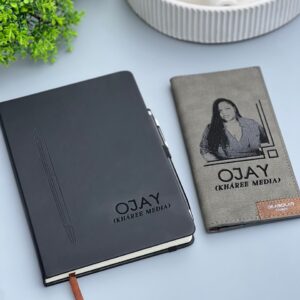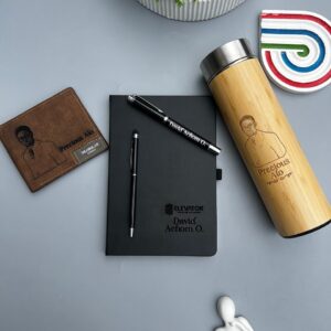 Black Magnetic Pen Notebook with Pen, Picture Page, Wallet and Wooden Flask