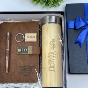Brown Vintage Passcode Notebook with Picture Page, Wooden Flask,Wooden Keyholder and Brown Ball Pen