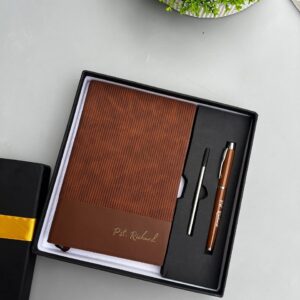 Brown Softline Notebook with Pen(REFILL),Wooden Alarmclock, Wooden Cufflinks,TieClip and Keyholder