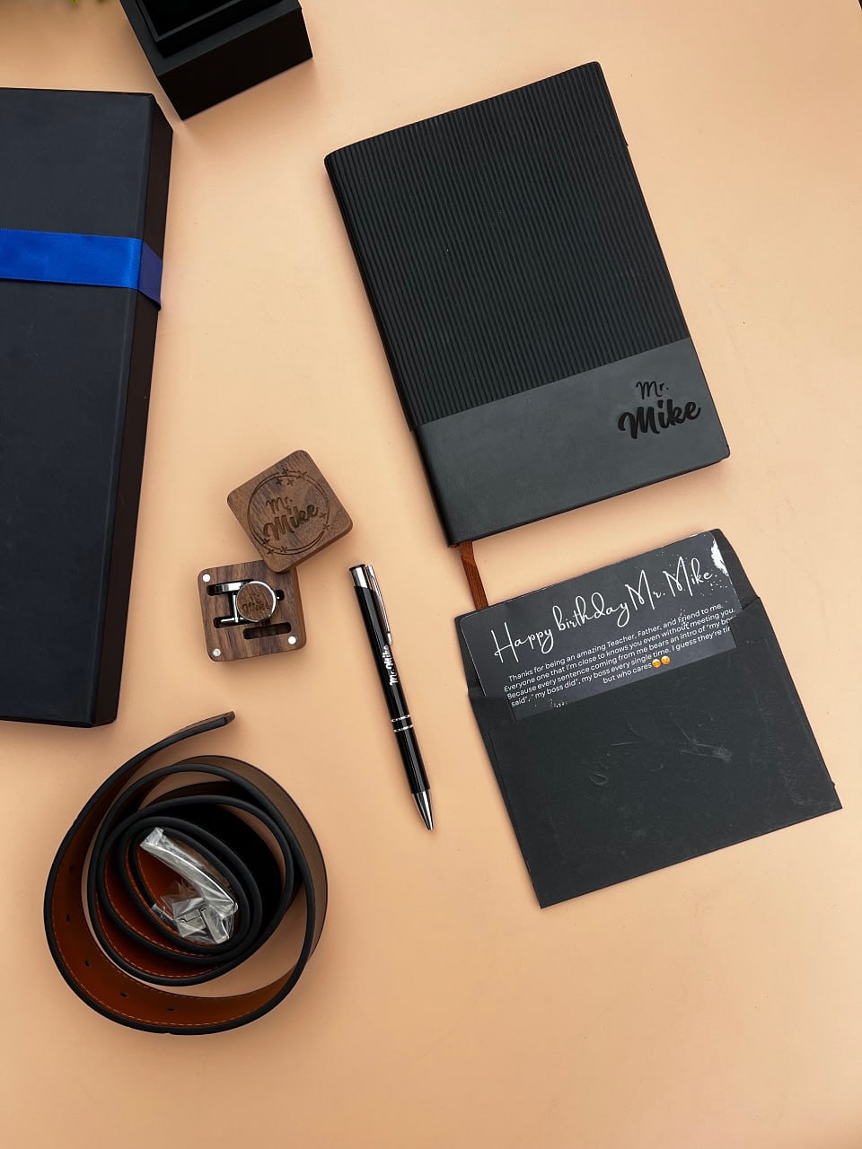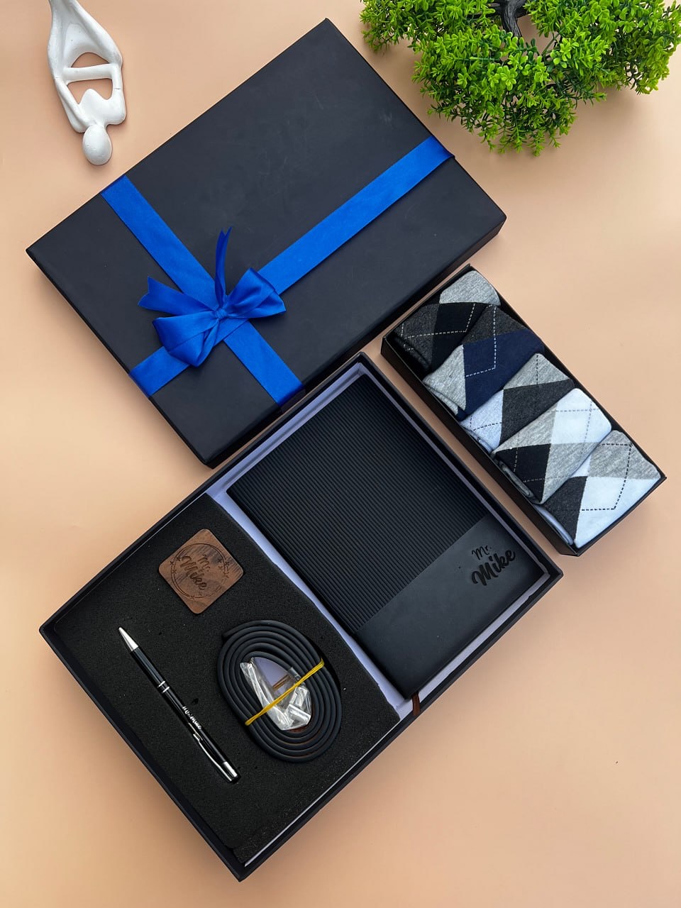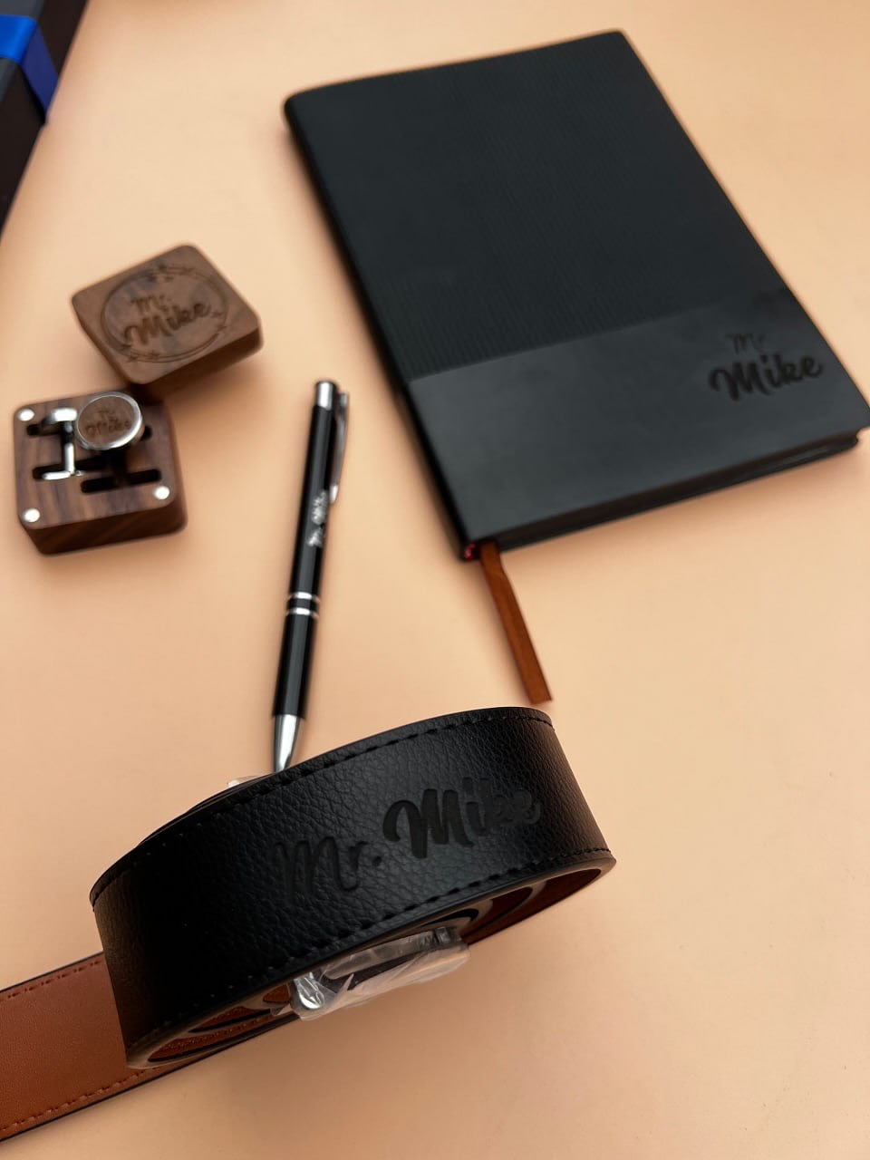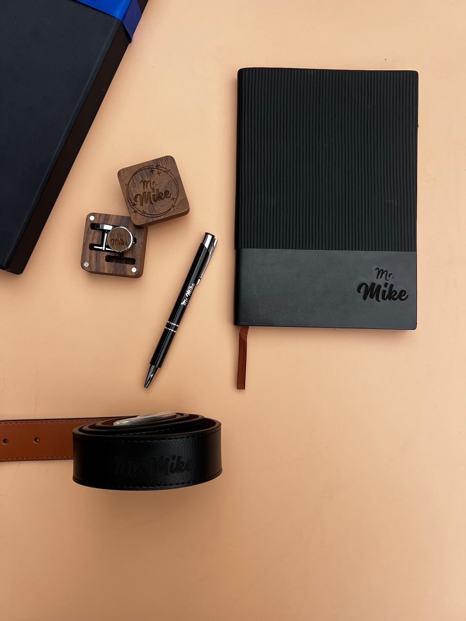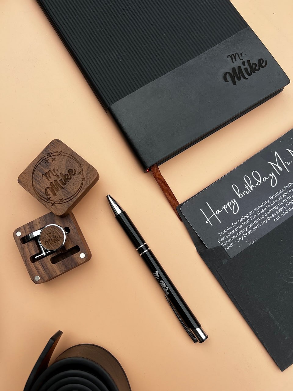 Black Softline Notebook with Pen, Sock Set, Wooden Cufflinks,Belt and a Notecard