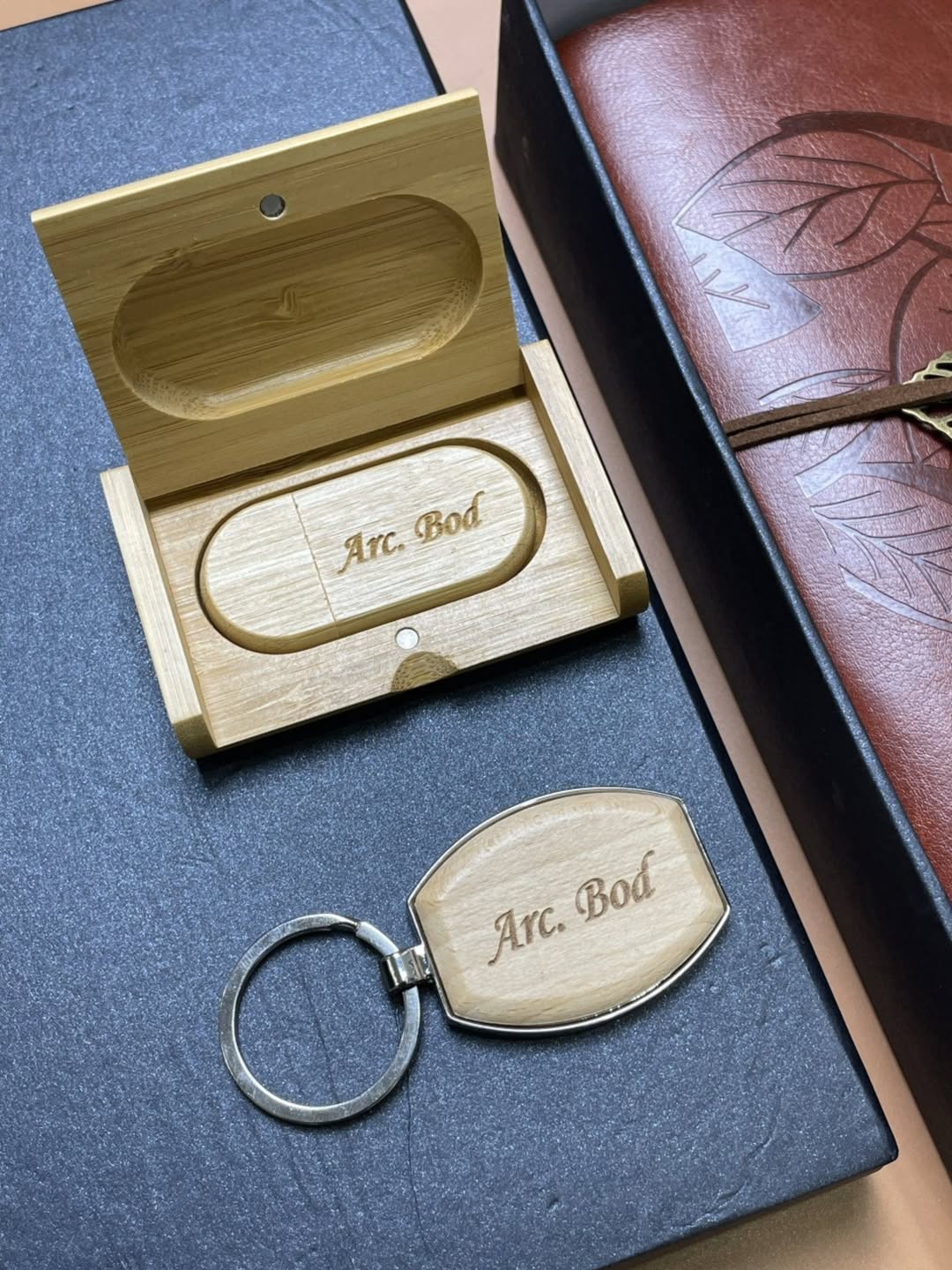Blood Red Leatherbound Notebook with Pen, Wooden Flash Drive