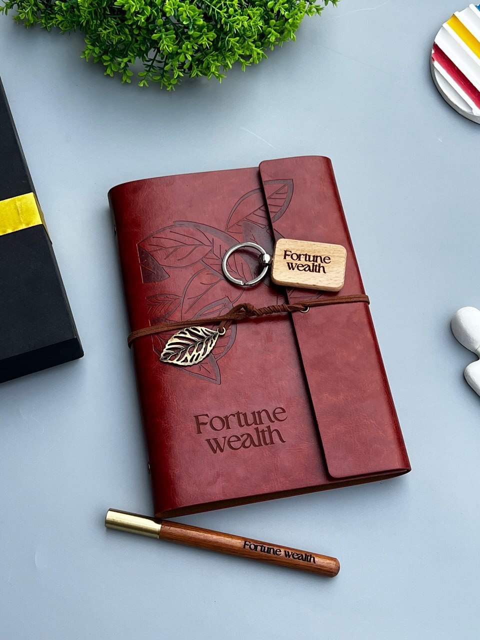 Leather Bound Notebook with Pen, Wooden Key Holder and Wallet