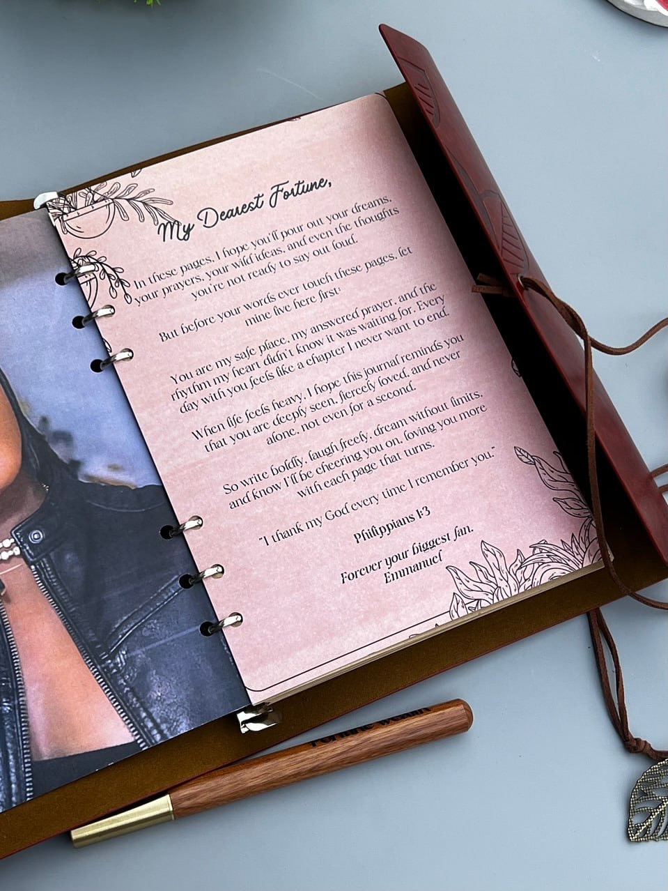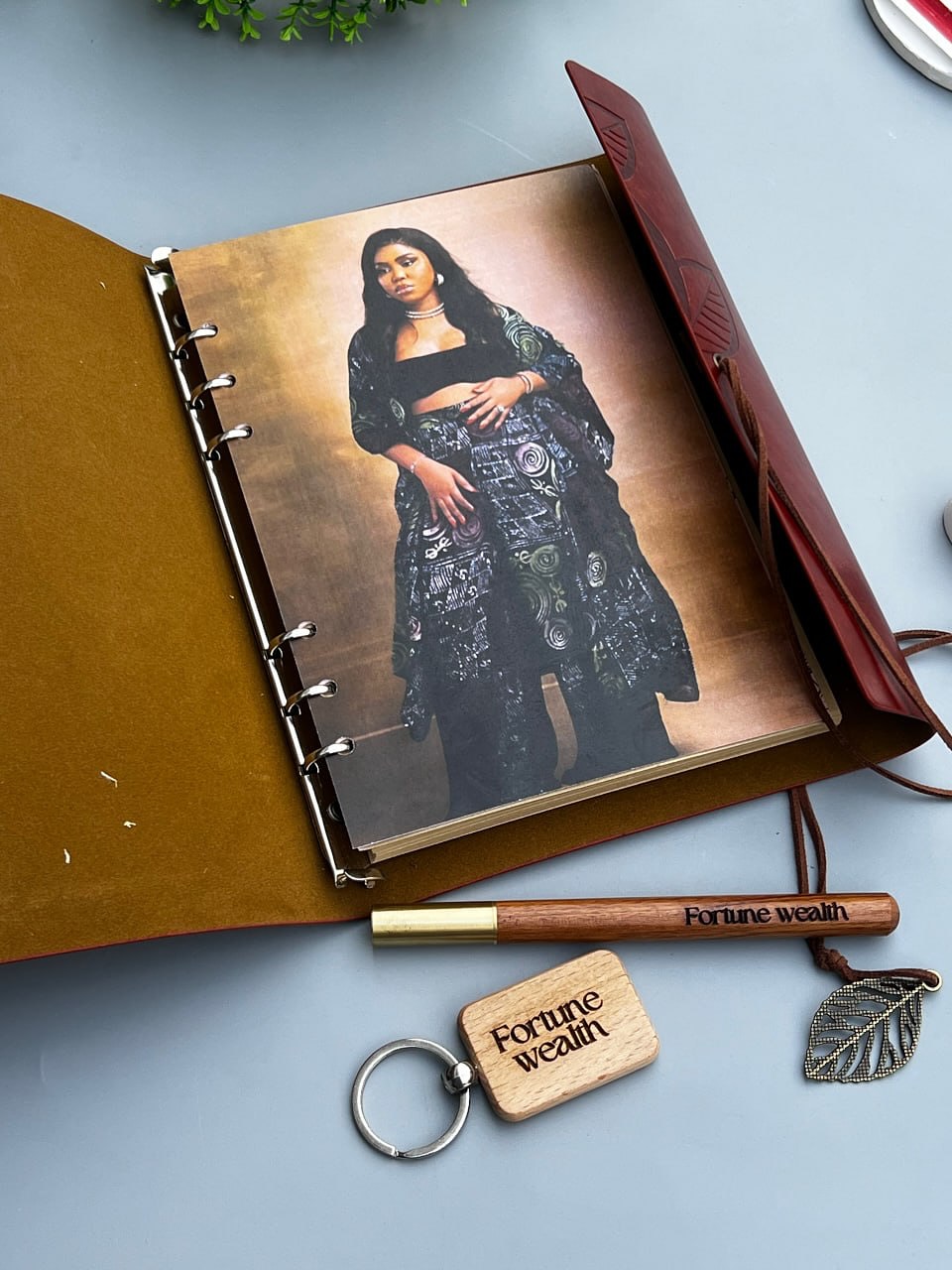 Blood Red Leatherbound Notebook with Picture Page,Wooden Keyholder and Pen