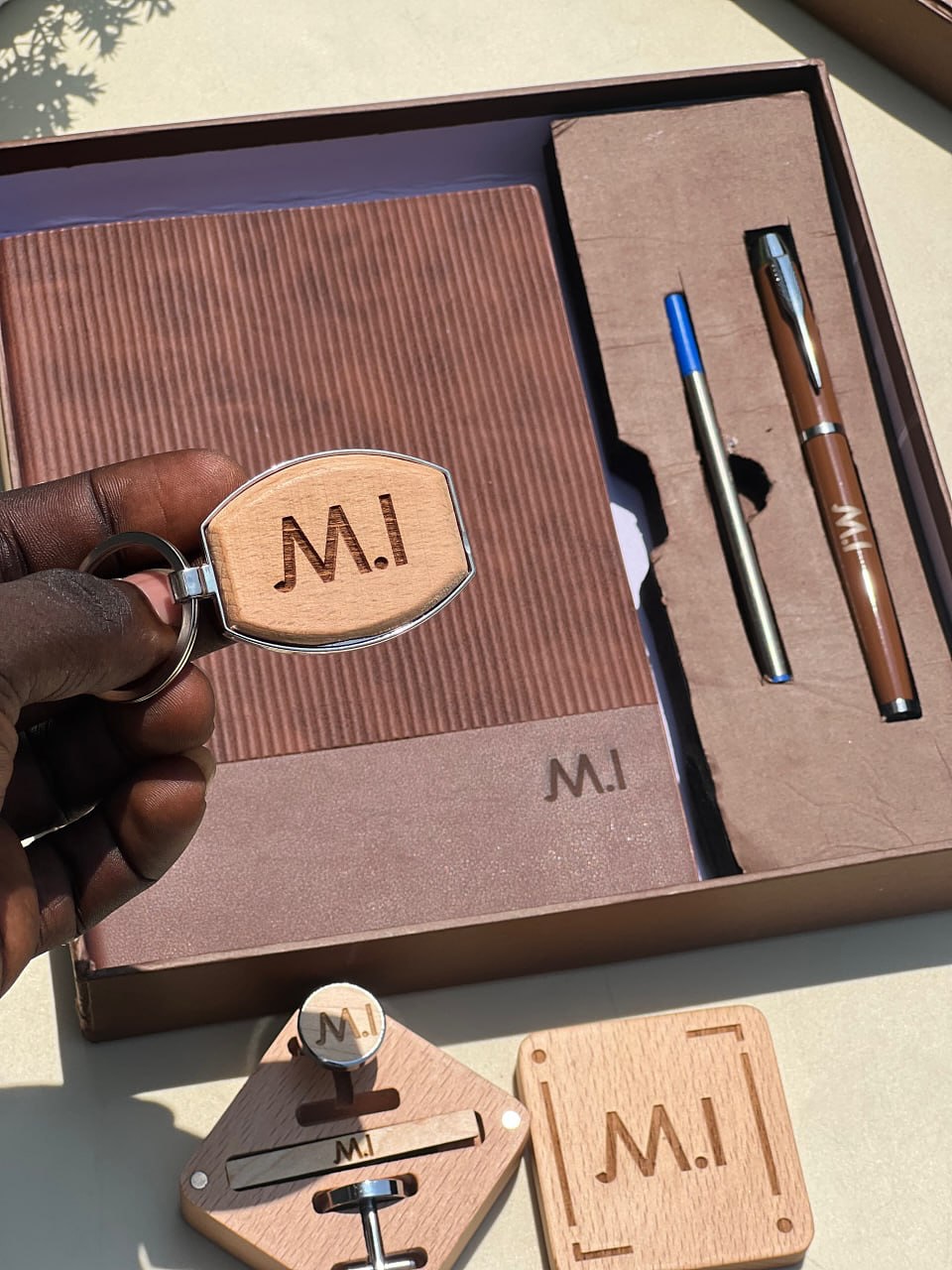 Brown Softline Notebook with Pen(REFILL),Wooden Keyholder, Wooden Cufflinks and Wooden TieClip quantity
