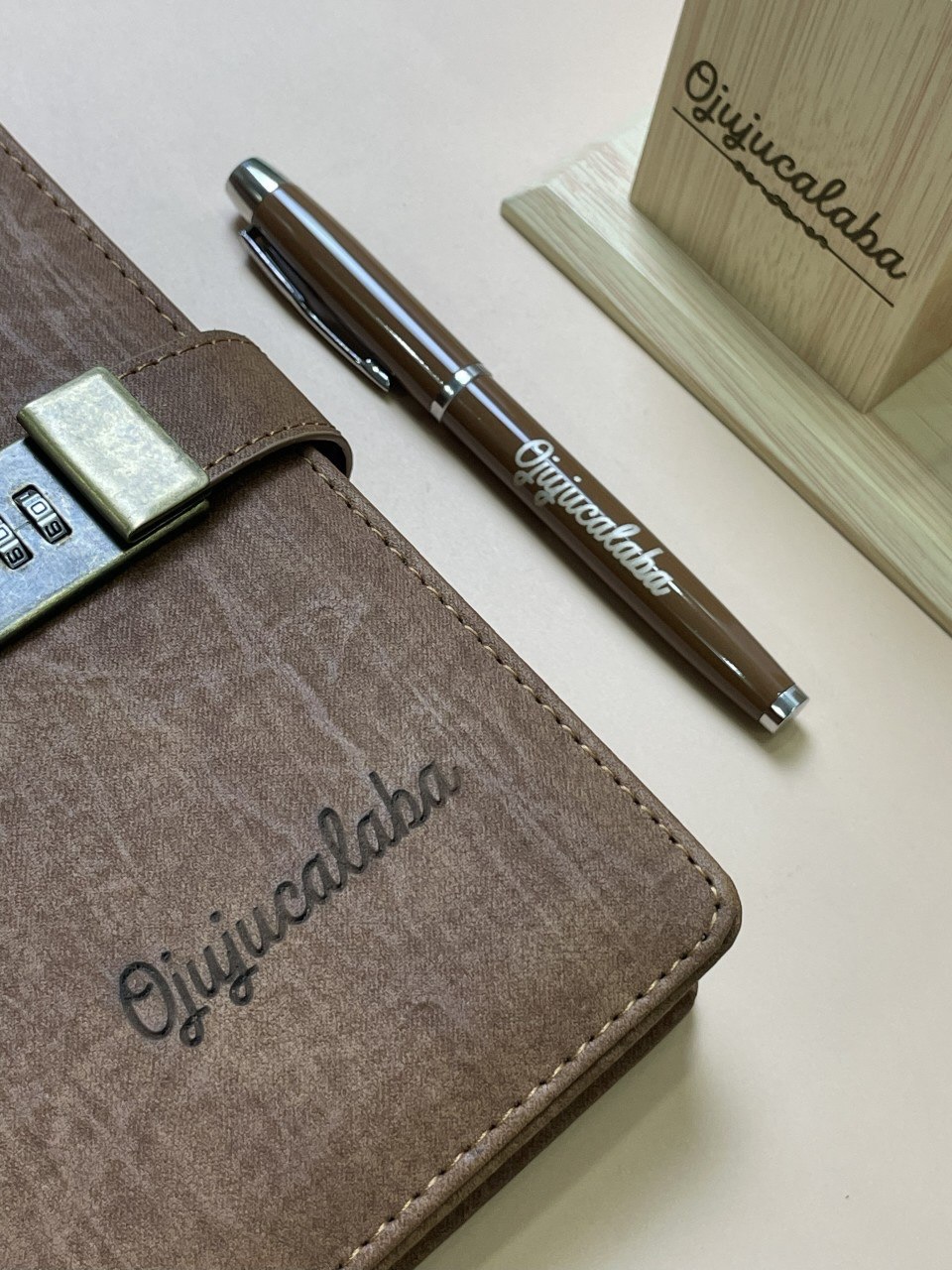 Brown Vintage Passcode Notebook with Pen and Wooden Alarm Clock quantity