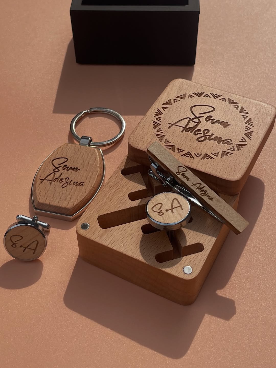 Brown Softline Notebook with Ball Pen(Refill), Wooden Keyholder, Cufflinks and Tie Clip