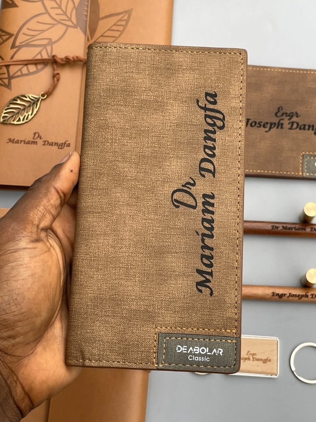 Tan Leatherbound Notebook with Pen, Wooden Keyholder and Wallet