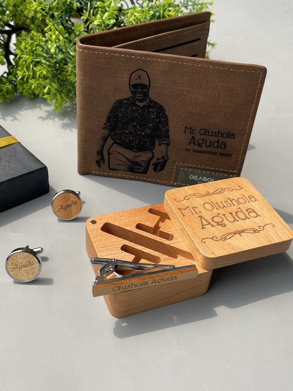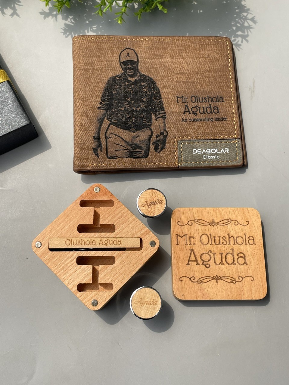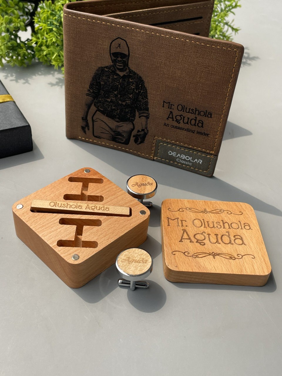 Wallet, Wooden Alarm Clock(with pen holder),Wooden Keyholder, Wooden Cufflinks and Wooden TieClip