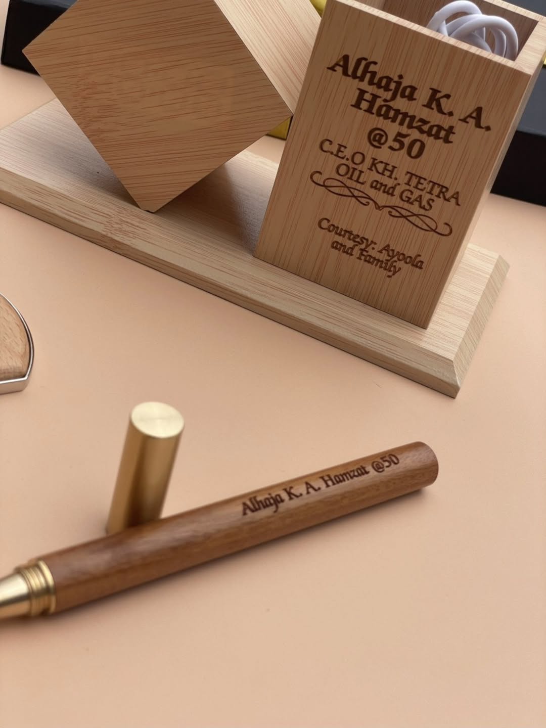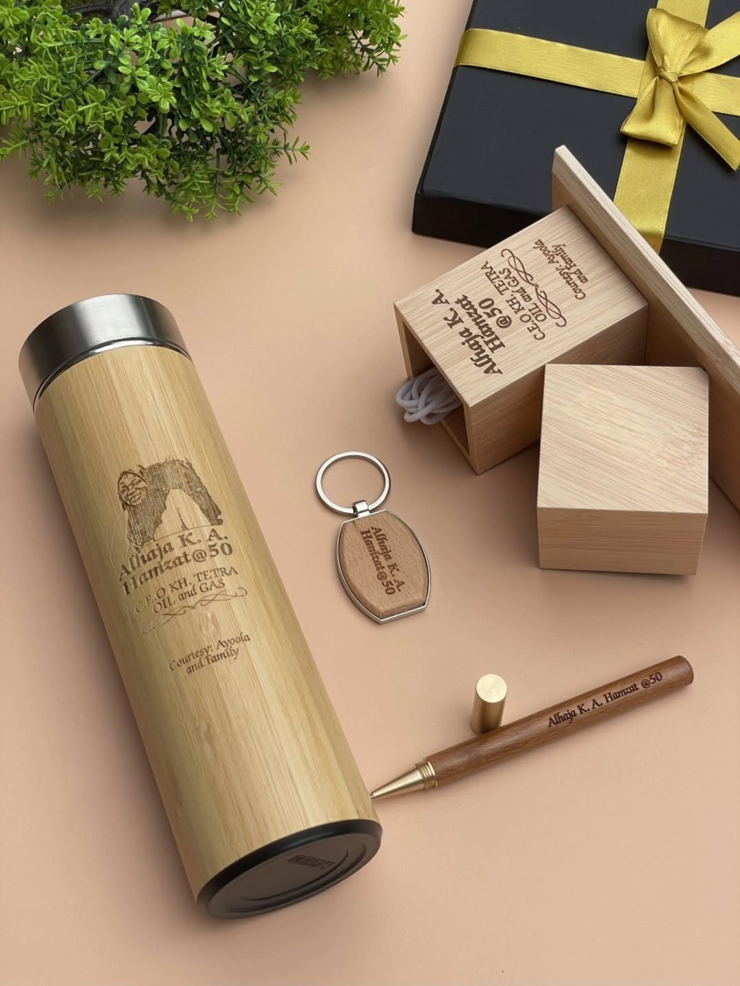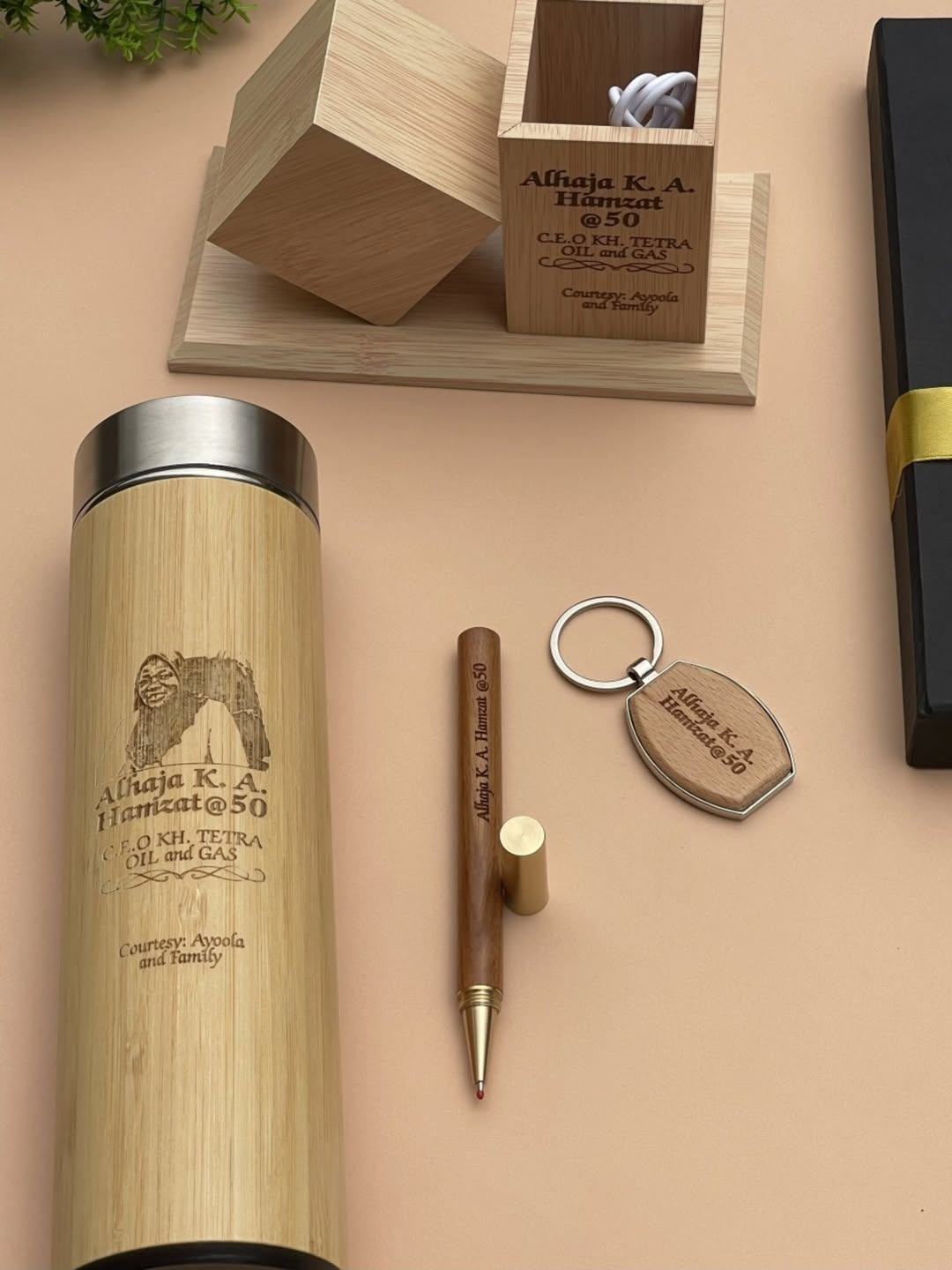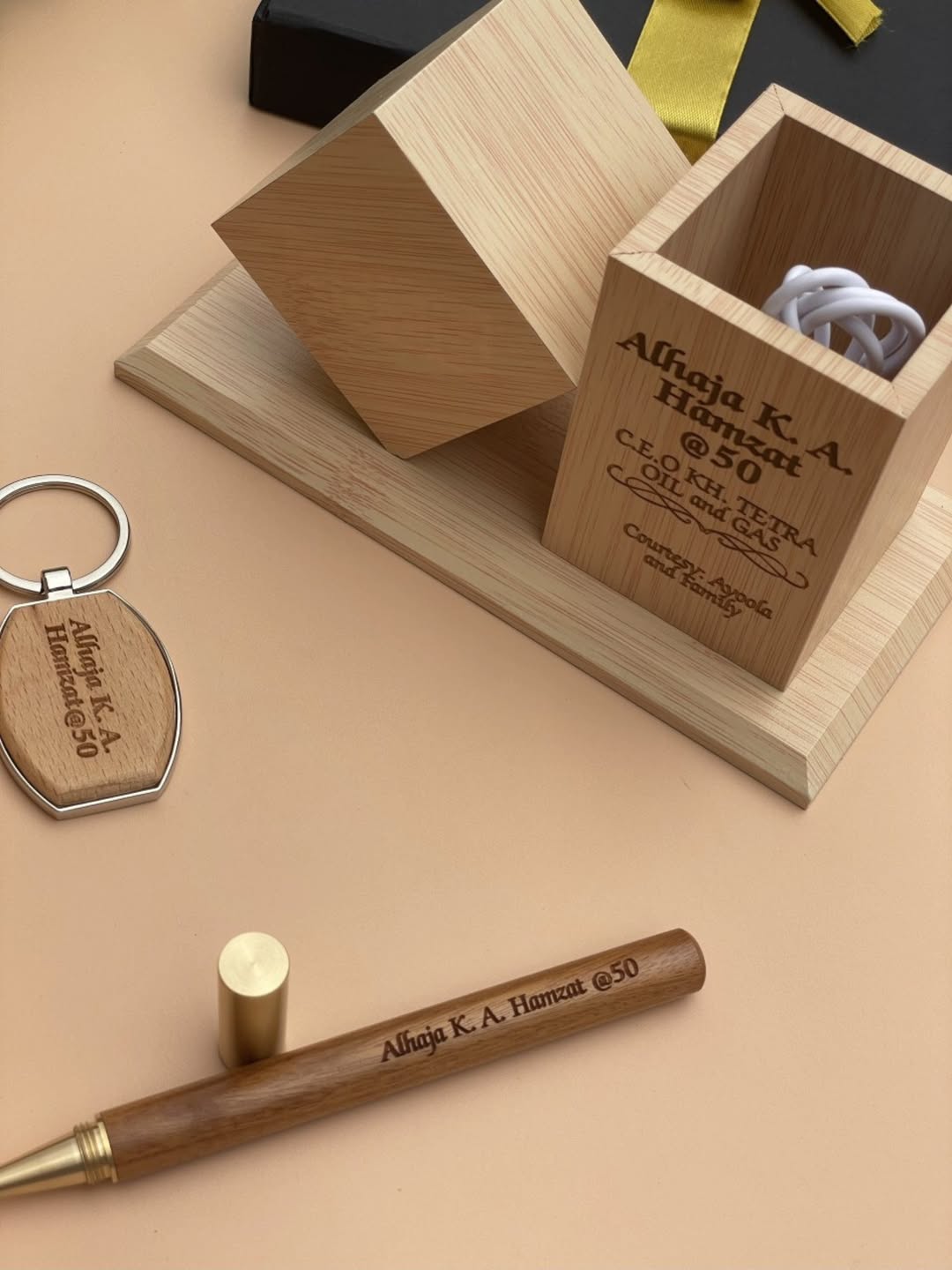 Wooden Alarm Clock with Wooden Ball Pen, Wooden Flask and Wooden Keyholder quantity