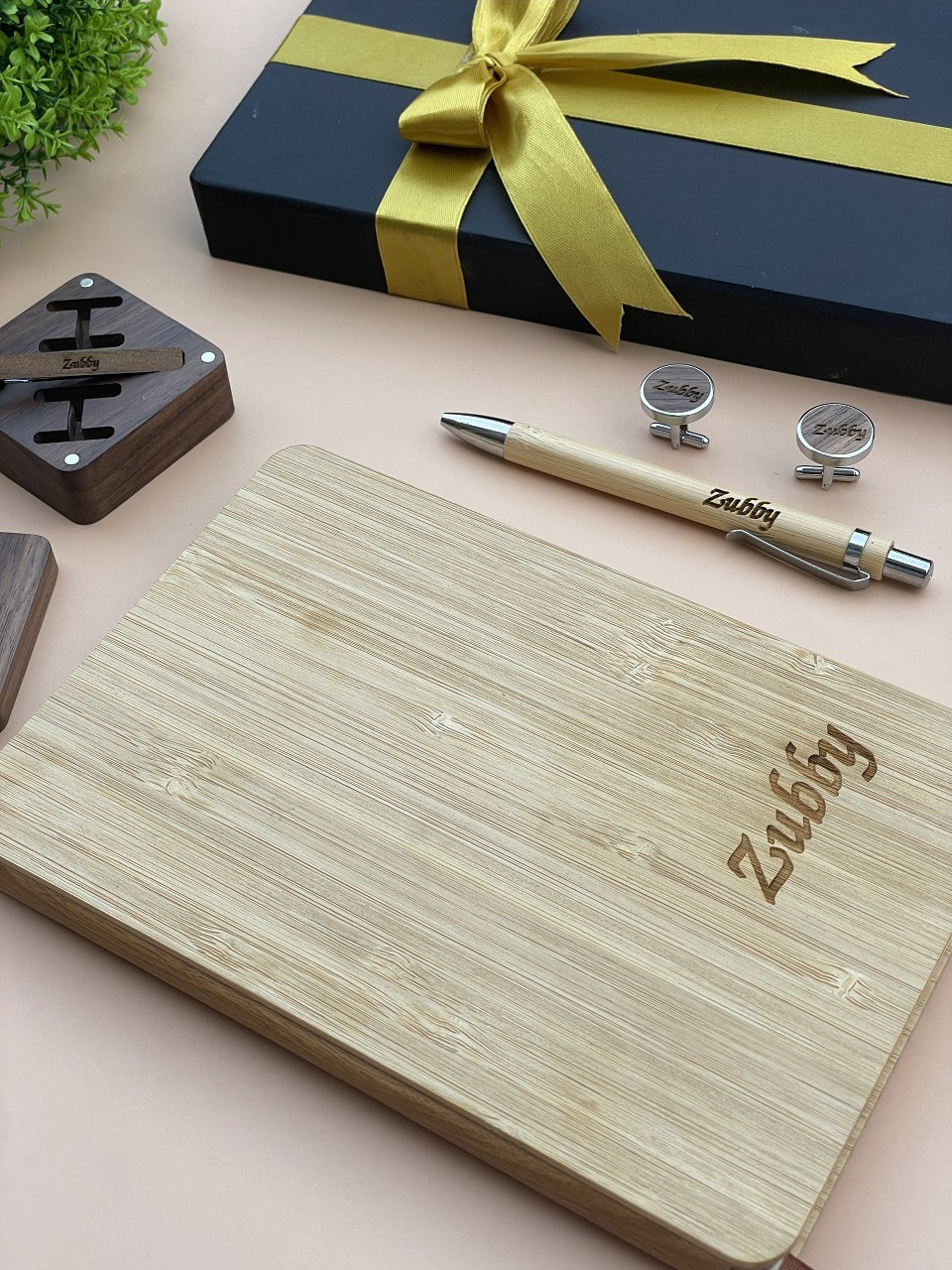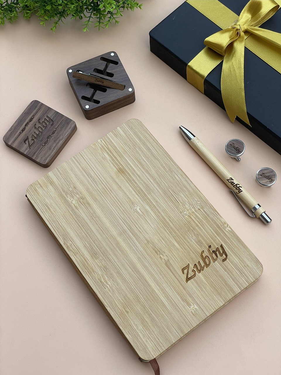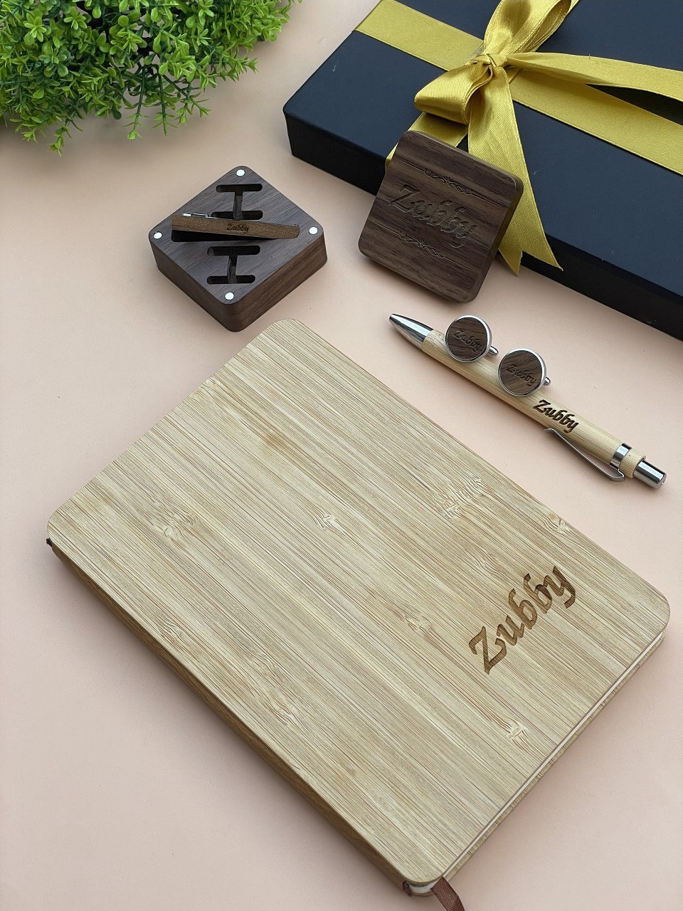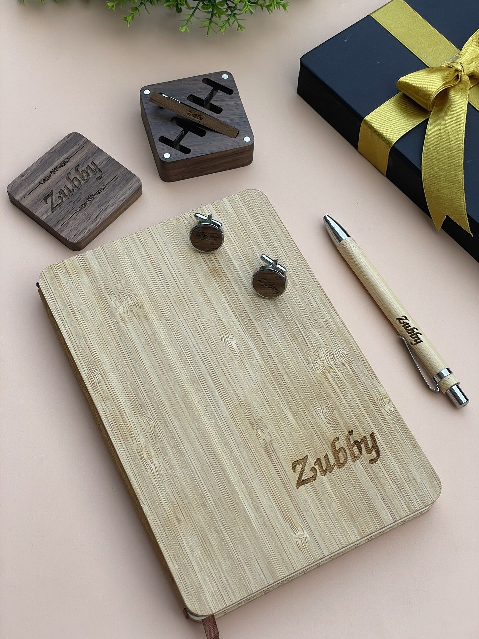 Wooden Notebook set(PEN) with Picture Page, Wooden Cufflinks and Wooden TieClip(DARK WOOD) quantity